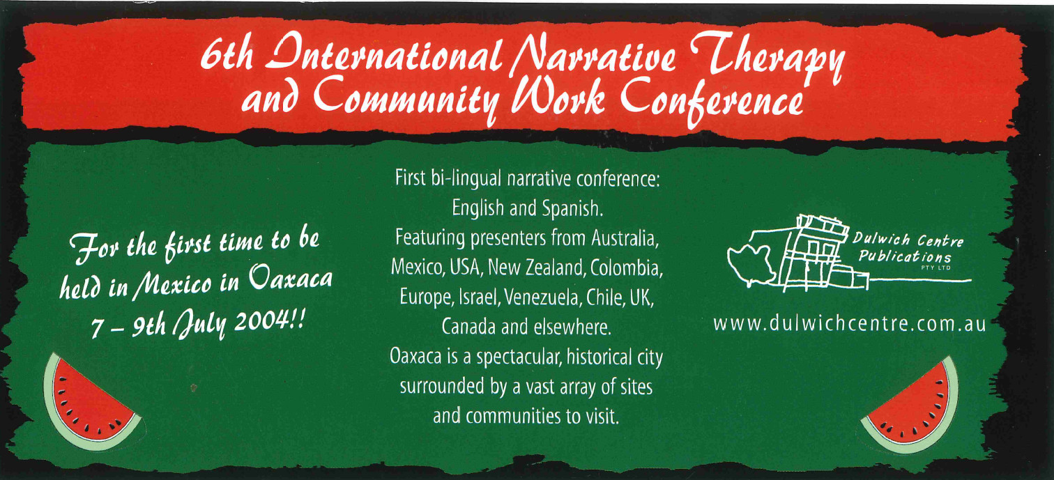 Since 1999 Dulwich Centre has hosted an International Narrative Therapy and Community Work Conferences. These conferences have been held around the world, from Australia to Mexico, the U.K, the U.S.A, Hong Kong, Norway, Brazil and Rwanda.
