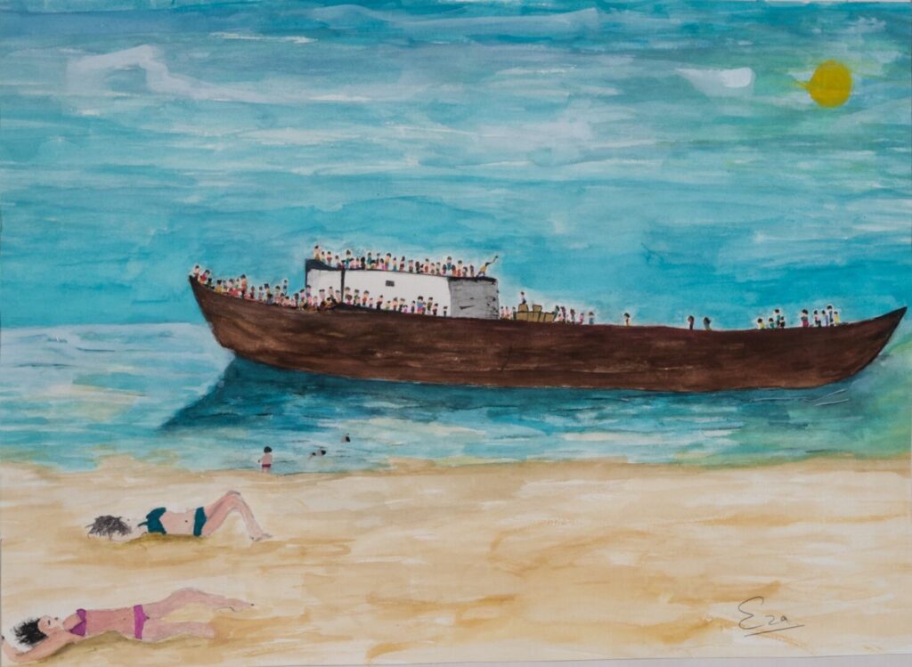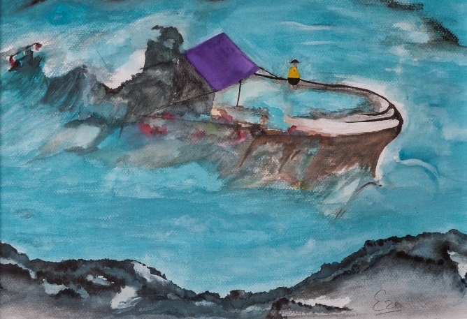 Refugees: a refugee is a person who has fled his or her own country, cannot return due to fear of persecution, and has been given refugee status. These two paintings show how refugees face hardship to reach safety and to find peace and happiness in a new country.